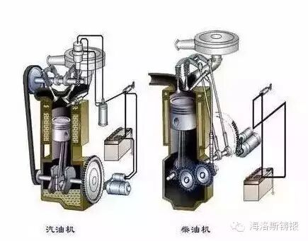 b)点燃式发动机:利用火花塞发出的电火花强制点燃燃料,使燃料强行着火燃烧。如汽油机、煤气机。