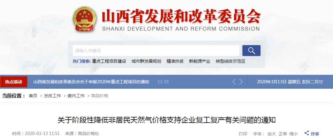 3月13日,山西省发展和改革委员会网站发布《关于阶段性降低非居民天然气价格支持企业复工复产有关问题的通知》(以下简称《通知》)。《通知》指出,从2020年2月22日至6月30日,山西省境内所有天然气生产经营企业提前执行淡季价格政策,对执行政府指导价格的非居民用气,山西省门站价格在基准门站价格的基础上下浮1%,即按每立方米1.7523元执行。